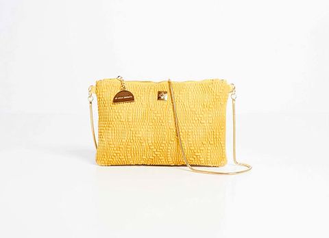 Bolso amarillo con textura y fino cordón dorado. Te irá genial si vas a lucir un vestido azul marino o morado, el contraste causará sensación. Este es de Mambo y lo encontrarás en www.elarmariodelatele.com por 28,50 €.