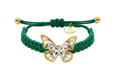Esta bonita pulsera verde dará un toque de color a cualquier look. Está realizada con macramé verde y detalles en plata bicolor. En el centro lleva una mariposa. El color verde de esta pulsera simboliza la esperanza, el empeño y la lucha. Esta es de la colección Yanes Young y su precio es de 70 €.