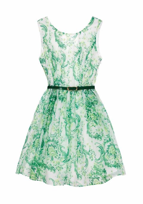 Un vestido sin mangas y con falda tipo skater, ideal para cualquier ocasión. Con este estampado en verde y blanco aportarás mucha alegría a tu armario. Este modelo es de la firma Molly Bracken y su precio es de 69,95 €.